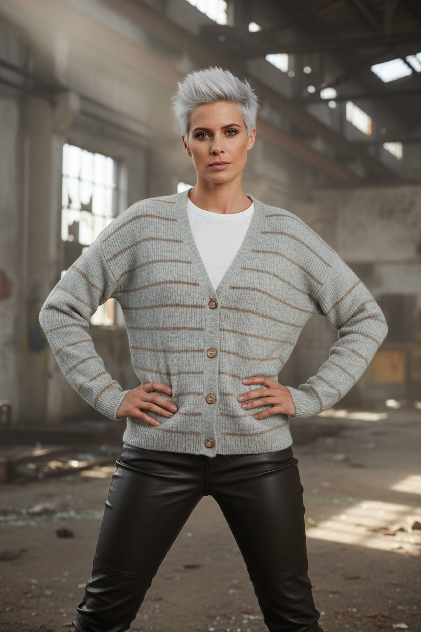 super lækker lysegrå strik cardigan med kobbertråd og guld knapper med en lille perle i midten.